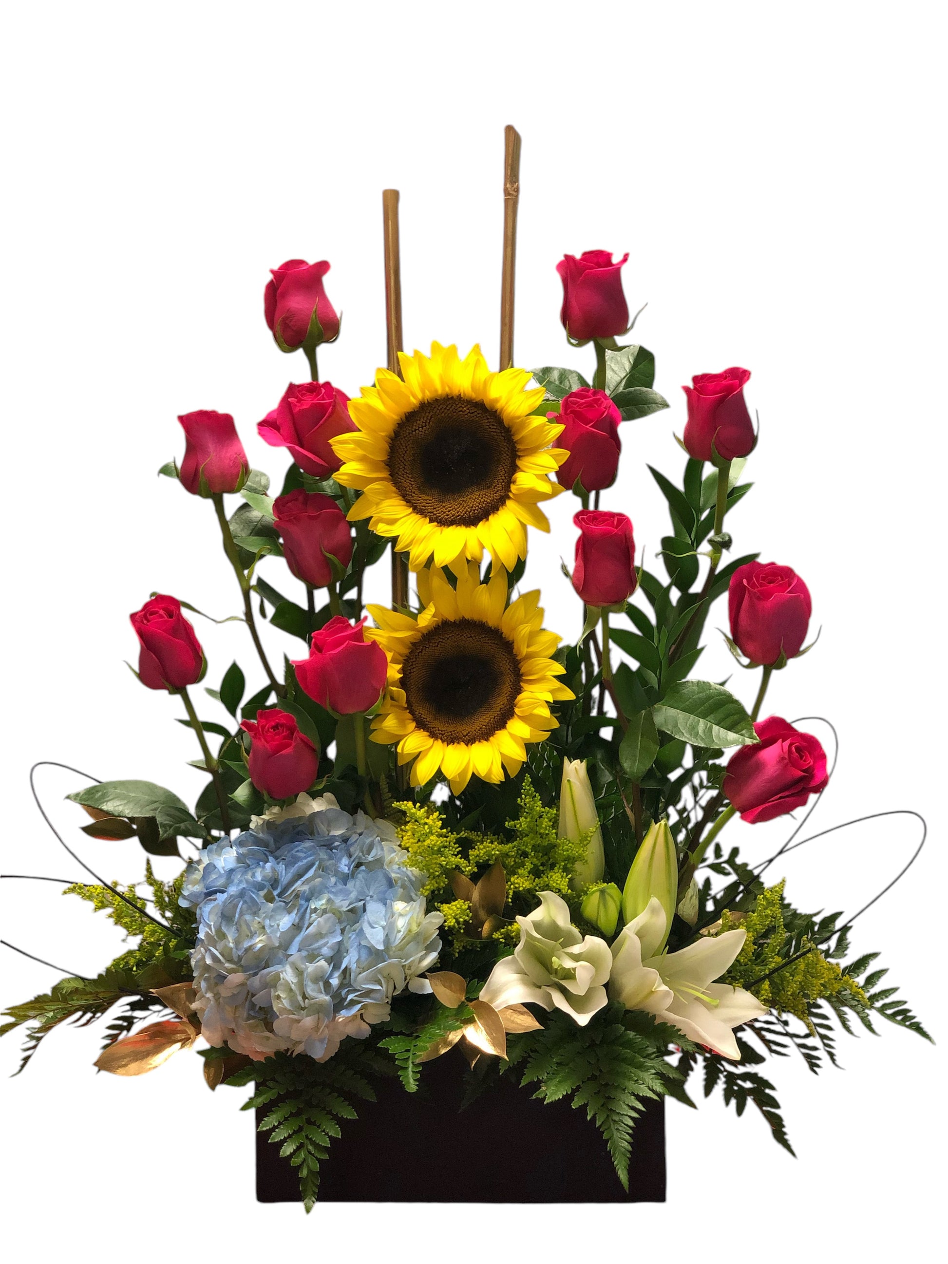 Beautiful combination of sunflowers, hydrangeas and Lillies the perfect detail to surprise your loved one